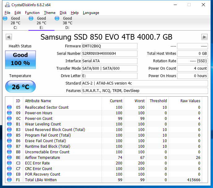 Crystal Disk Info is a great tool for displaying the characteristics and health of storage devices. It displays everything from temperatures, to the number of hours the device has been powered, and even to the extent of informing you of the firmware of the device.