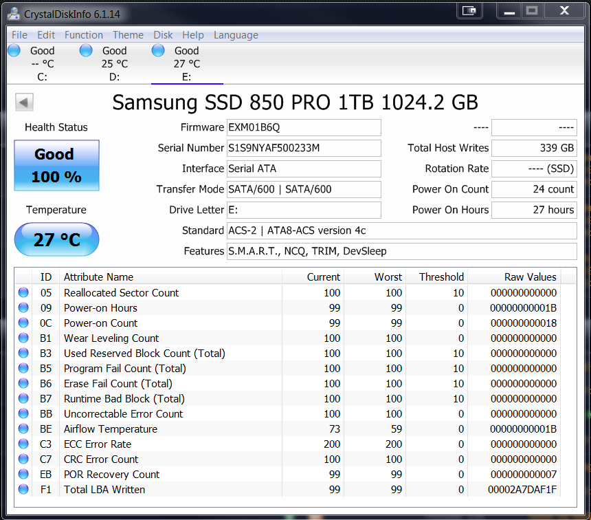 It is ideal that Samsung has include only key S.M.A.R.T. attributes in which to monitor the drive over time. The Total Host Writes of 339GB represent testing at about the half-way mark for us on this drive. Those familiar with Crystal DiskInfo will immediately notice this latest version capable of identifying those SSDs capable of DEVSLP.