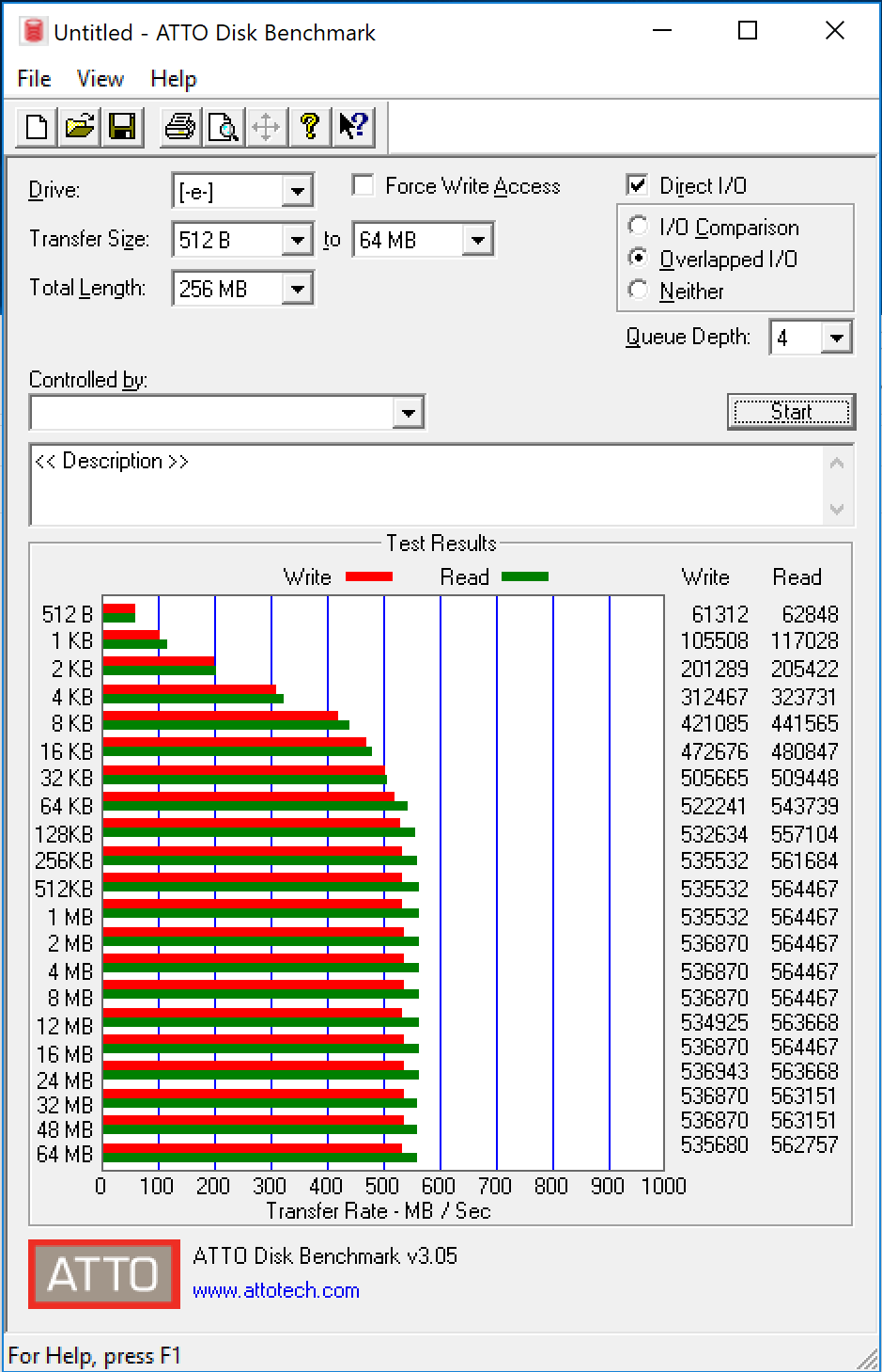 ATTO Disk Benchmark is perhaps one of the oldest benchmarks going and is definitely the main staple for manufacturer performance specifications. ATTO uses RAW or compressible data and, for our benchmarks, we use a set length of 256mb and test both the read and write performance of various transfer sizes ranging from 0.5 to 8192kb. Manufacturers prefer this method of testing as it deals with raw (compressible) data rather than random (includes incompressible data) which, although more realistic, results in lower performance results.