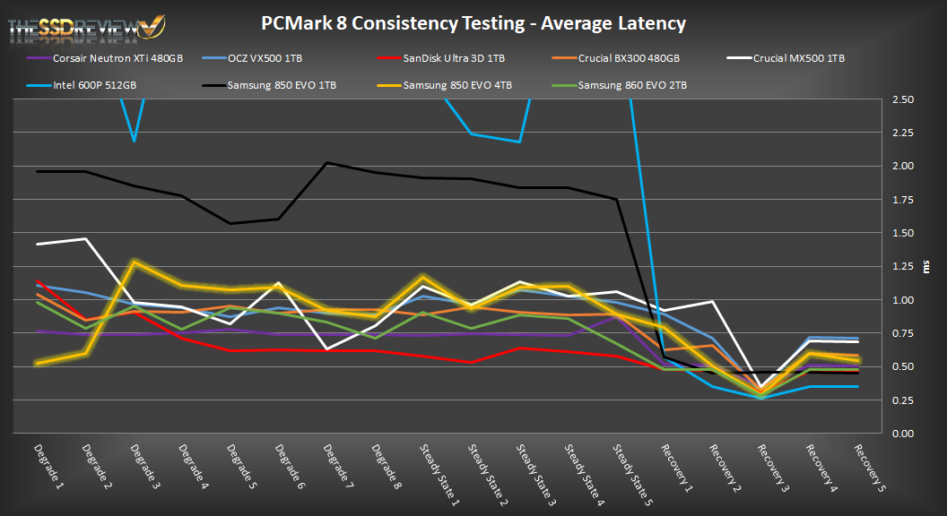In reading the results, the Degrade and Steady State phases represent heavy workload testing while the recovery phase represents typical consumer light workload testing.