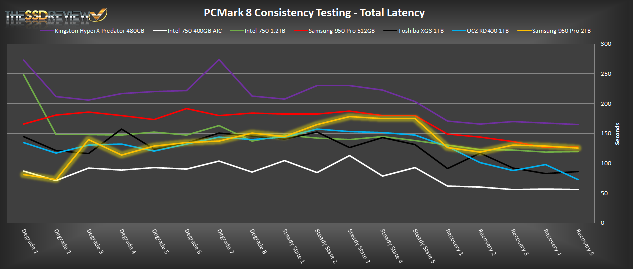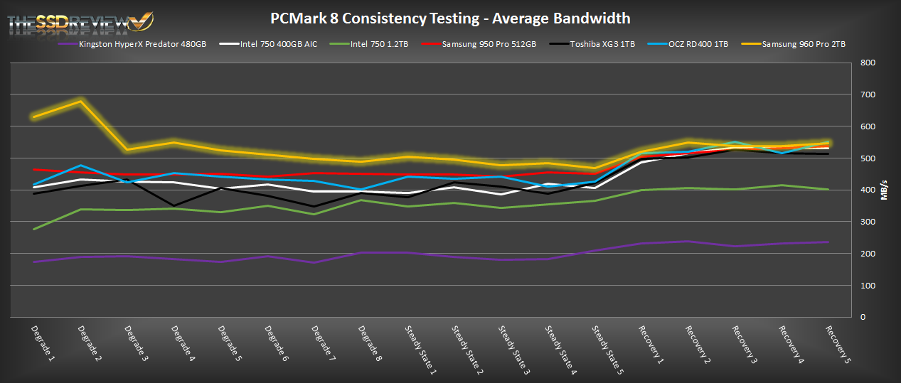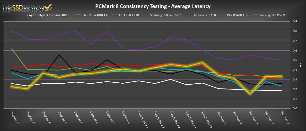 In PCMark 8’s extended test we can see that the Samsung 960 Pro trump’s all in terms of sheer bandwidth performance. Averaging 525MB/s during the heavy workload phase and 537MB/s during the recovery phase one can see how consistent this drive is under any workload. Looking at latency performance we can see that it does have some competition in this scenario. The Intel 750 has lower latency overall and both the Toshiba XG3 and OCZ RD400 outperform it there as well. though all are beat out by the Intel 750 400GB. The Kingston HyperX Predator lags behind a bit compared to the rest due to its utilization of the AHCI protocol rather than NVMe. In terms of bandwidth, the Samsung 950 Pro is just barely the victor under heavy workloads and the 1TB RD400 takes the lead overall during the recovery section.