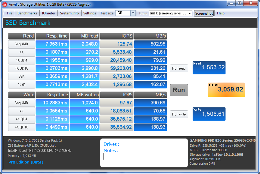 You may not see this for long (and its definitely not common) but you get a freebee simply for reading! Over the last little while, we have been assisting with beta testing new benchmark software called Anvil Storage Utilities which is an absolutely amazing SSD benchmarking utility. Not only does it have a preset SSD benchmark, but also, it has included such things as endurance testing and threaded I/O read, write and mixed tests, all of which are very simple to understand and utilize in our benchmark testing. Recently, we published the exclusive public release here and, if you happen to check it out, there is a FREE download of the software! Lets see how the Samsung 830 Series 6Gbps 256GB SSD fares on Anvil Pro:
