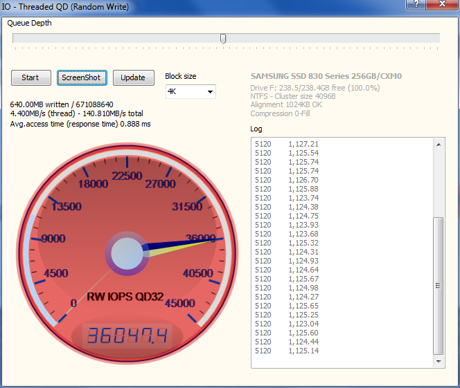 There is another difference with the 830 compared to most other drives, in that, it has been tuned to provide high 4k random READ scores whereas we have become comfortable with the 4k random aligned write disk access IOPS result. Their specs list 80,000 and 36000 IOPS for read and write at 4k aligned random disk access, respectively, whereas we are just a bit under at 73954 and 23414 IOPS.