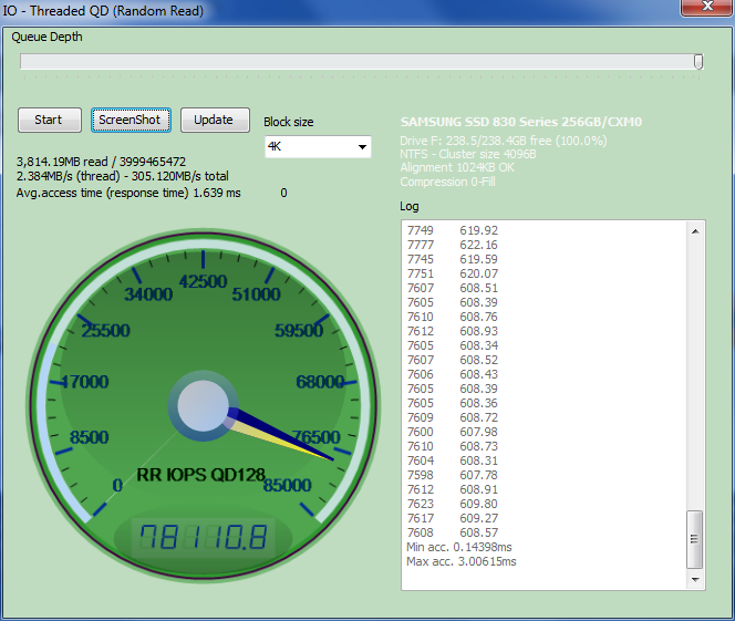 We decided to try and achieve the highest IOPS possible through Anvils user configurable tests and achieved slightly better results. A close look will show that the READ result of 78110 IOPS on the left was done at 4K – QD128!