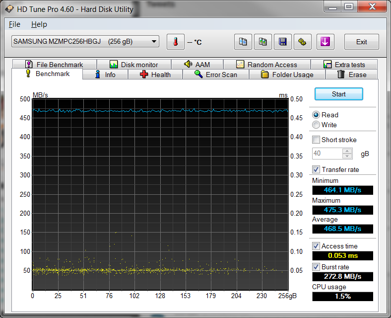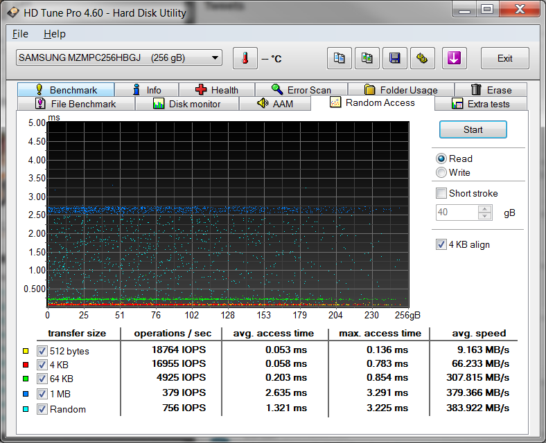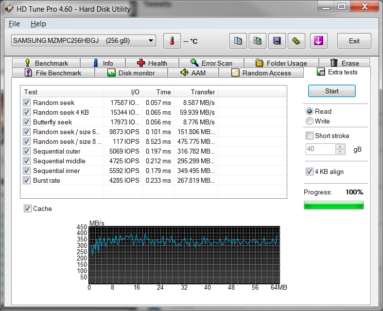 HDTune Pro consists of several tests that really round our SSD testing. Along with the great disk access speed of 0.053ms we see in the first bench, the Random and Extra testing confirms that this SSD is solid in SATA 3 transfer speeds.