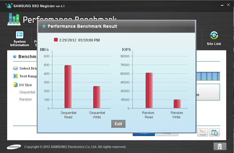 Samsung SSD Magician is a free download and probably the most complete ‘toolbox’ available today as it, not only optimizes and fine tunes your system and SSD, but also, it allows the user to adjust over provisioning to suit their needs. Our original intent was to do a secure erase with it in order to see if test results changed but we quickly learned that the Samsung SSD Magician is not compatible with the new PM830 SATA 3 line. We were still able to pull up a performance test though: