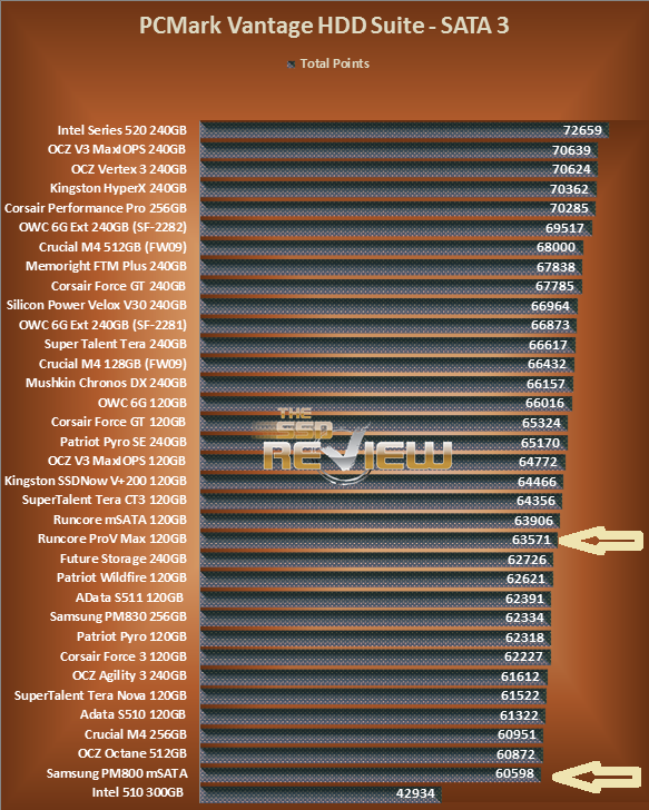 The two arrows display the only two mSATA SSDs to reach the 60,000 plateau, these being the PM830 and the Runcore T50 120GB ‘SandForce Driven’ mSATA SSD. The big difference between the two, of course, is the fact that only the Samsung PM830 is available in 256GB capacity while the Runcore is restricted to 120GB max.