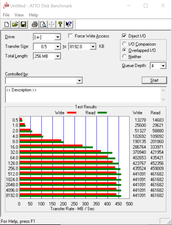 Taking a look at ATTO Disk Benchmark Performance, the gradual speed progression throughout file says is the sign of a very strong SSD. On top of this, performance increases very quickly, although not as fast as a SATA connected SSD. High data transfer speeds of 461MB/s read and 441MB/s write are very close to the general listed specs, however, above that for specs listed for different OS’s. We are using Windows 10.1.