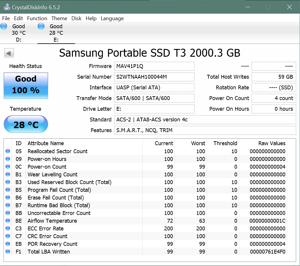 Crystal Disk Info is a great tool for displaying the characteristics and health of storage devices. It displays everything from temperatures, to the number of hours the device has been powered, and even to the extent of informing you of the firmware of the device.