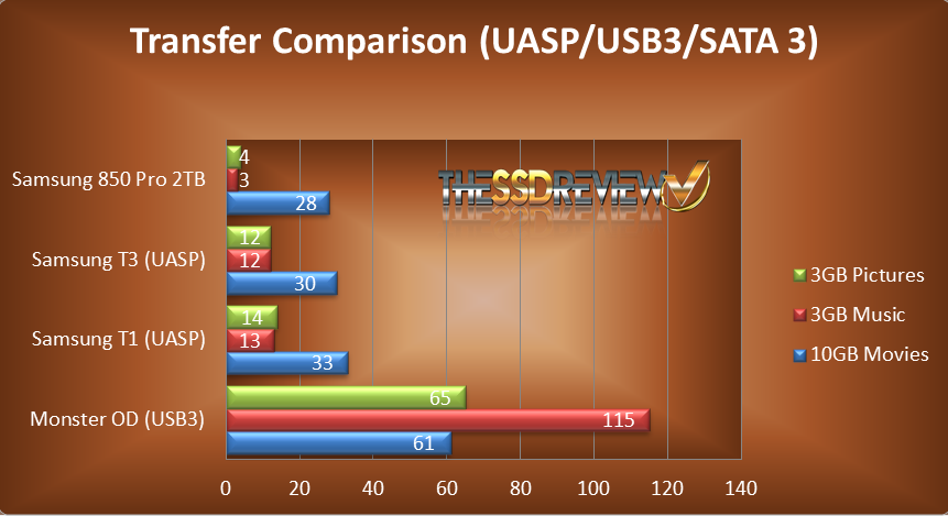 In the chart below, we compared our newest 2TB Samsung T3 Portable SSD (UASP), the previous 1TB Samsung Portable T1 SSD (UASP), our 1TB Monster OverDrive 3.0 (USB3.0) and then threw in our OS SSD, the Samsung 2TB 850 Pro (SATA) for good measure. The sample files were 3GB of music, 3GB of pictures and 10GB of HD movies and the speed was measured by transferring the data to the external device from the OS SSD, or to a separate folder in the case of our system disk.