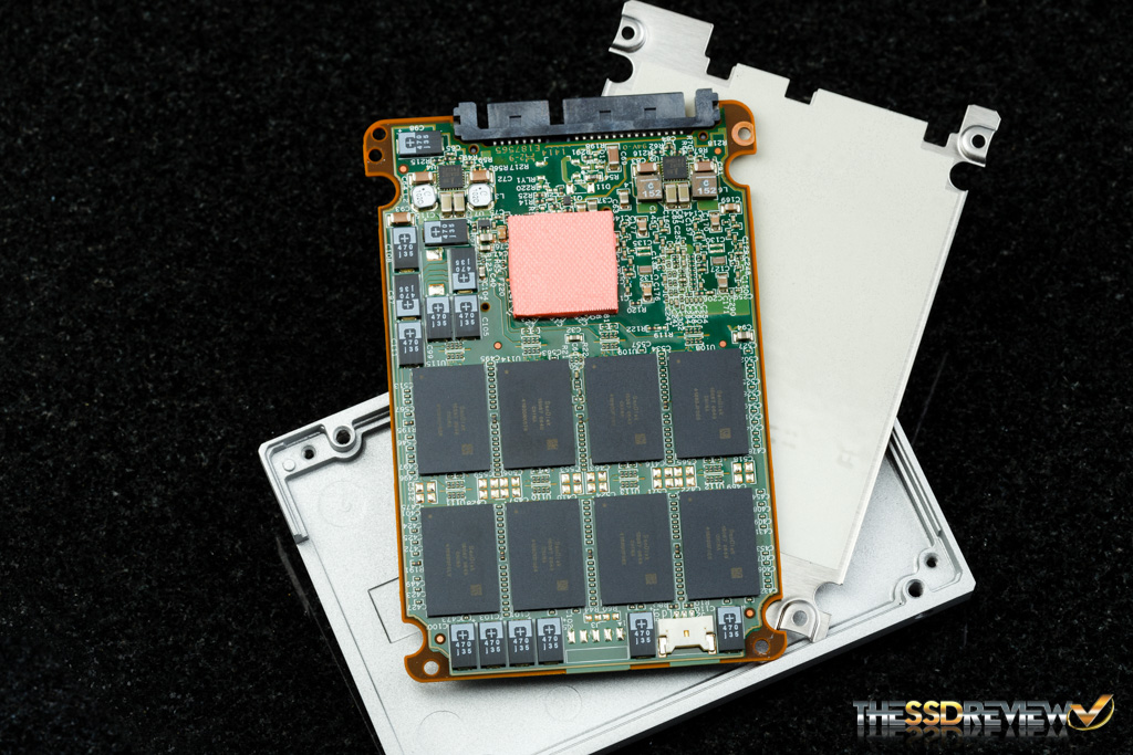 The all-metal shell is held together by four Loctite screws and once fully disassembled we can see that this SSD is similar to many other SATA 6Gb/s based drives. There is a DRAM buffer, a single controller, and 16 NAND packages.