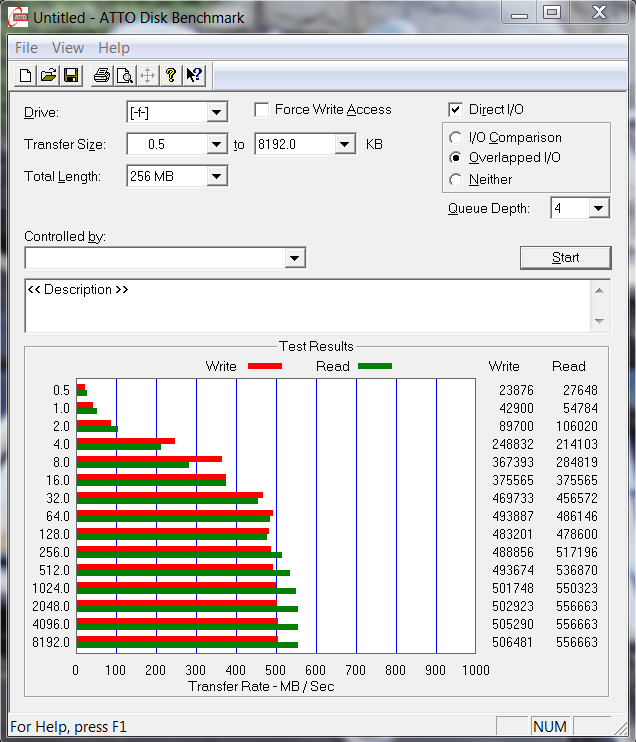 SanDisk specifications list the Extreme at 550MB/s read and 520MB/s write which seems to be right on the money as we see results of 556MB/s read and 506MB/s write. Normally, a small fluctuation can be expected and subsequent testing will show results that may be a bit higher or lower.
