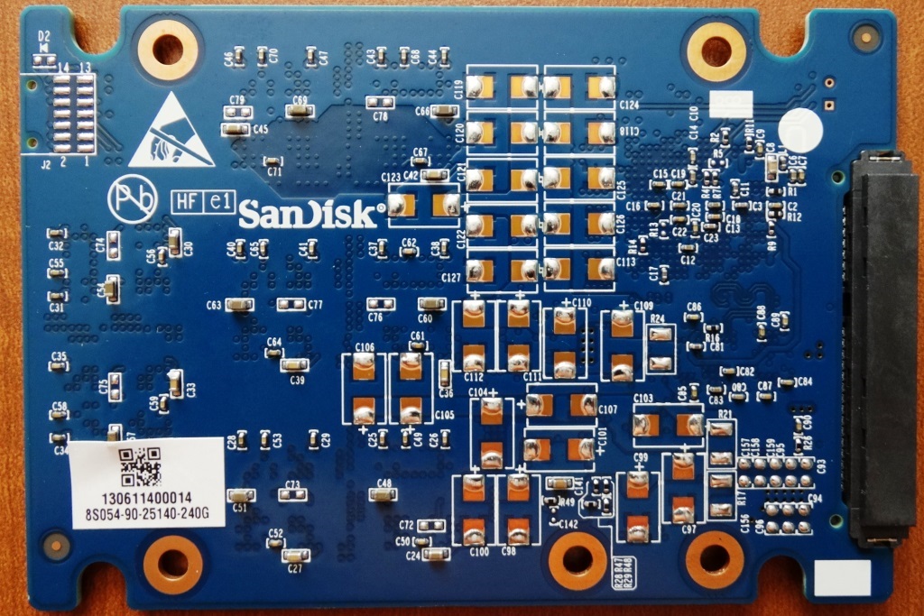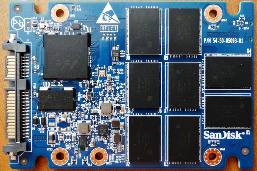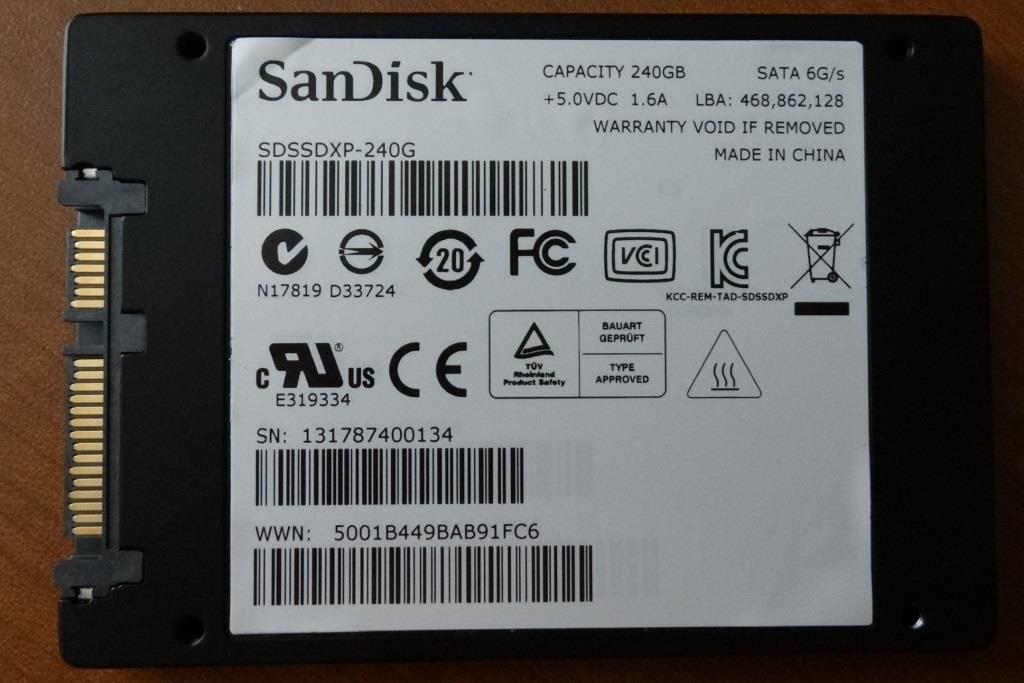 Looking at the printed circuit board (PCB), we have the Marvell 88SS9187-BLD2 ‘Monet’ controller, Samsung 256MB DDR3-1600 DRAM cache below the controller and eight modules of SanDisk 19nm Toggle Mode eX2 ABL MLC 3K P/E cycle NAND flash memory. Each module is 32GB in size for a total of 256GB RAW capacity, however, 7% over provisioning reduces this to the advertised capacity of 240GB. Formatting the drive then leaves the user with 224GB of available disk (or rather SSD) space.