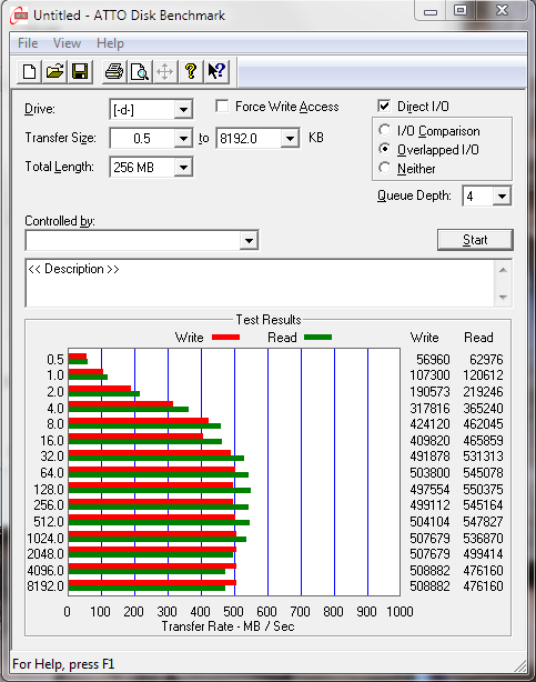 Performance highs of 550MB/s read and 508MB/s write are a bit lower than that in which we saw with the 240GB version and as described in the manufacturers listed specifications.
