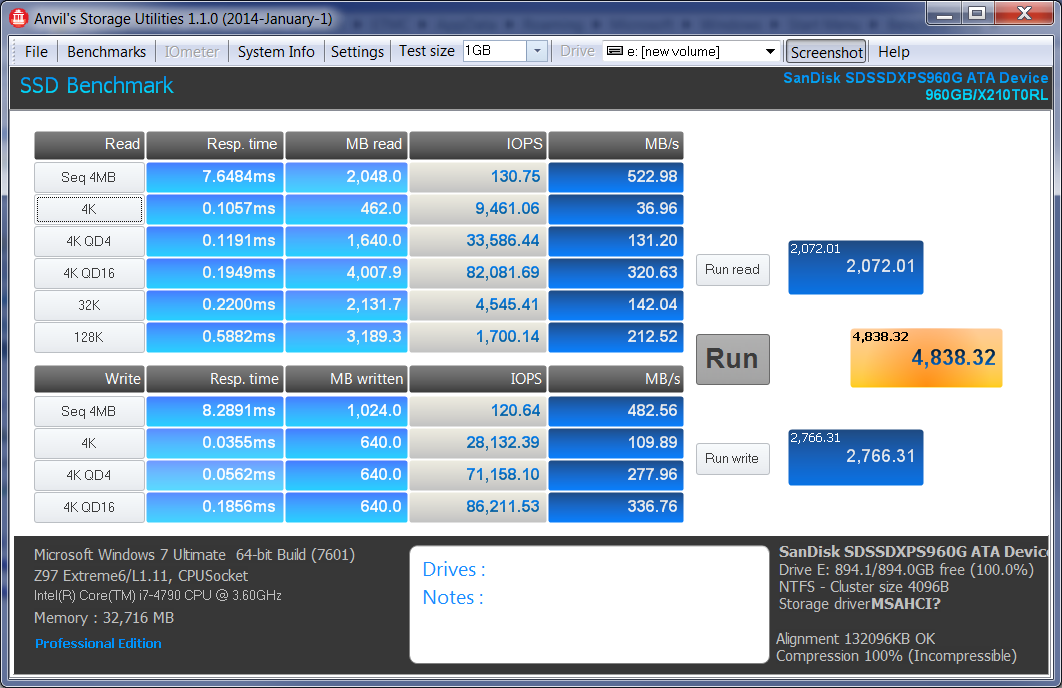 Anvil Storage Utilities (ASU) are the most complete test bed available for the solid state drive today. The benchmark displays test results for, not only throughput but also, IOPS and Disk Access Times. Not only does it have a preset SSD benchmark, but also, it has included such things as endurance testing and threaded I/O read, write and mixed tests, all of which are very simple to understand and use in our benchmark testing.