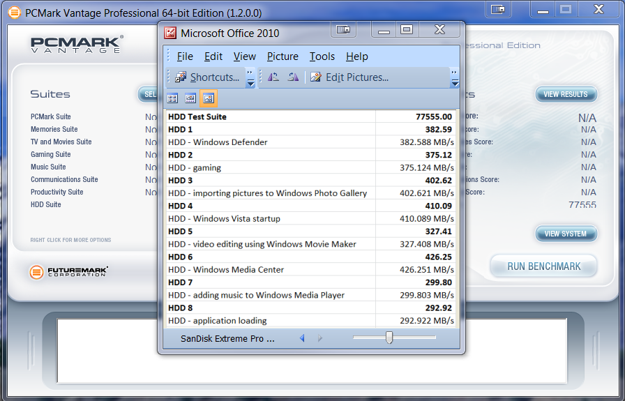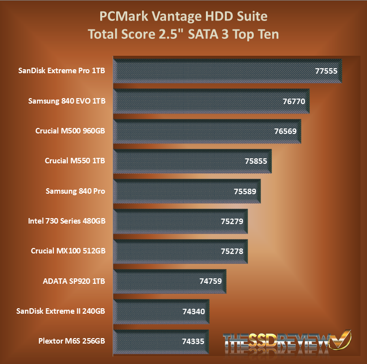 The SSD Review uses benchmark software called PCMark Vantage x64 HDD Suite to create testing scenarios that might be used in the typical user experience. There are eight tests in all and the tests performed record the speed of data movement in MB/s to which they are then given a numerical score after all of the tests are complete.