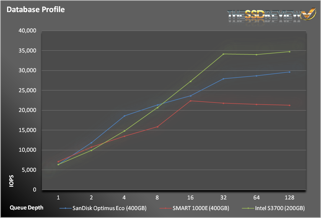 For our database profile, the Optimus Eco trails the Intel S3700 at higher queue depths.