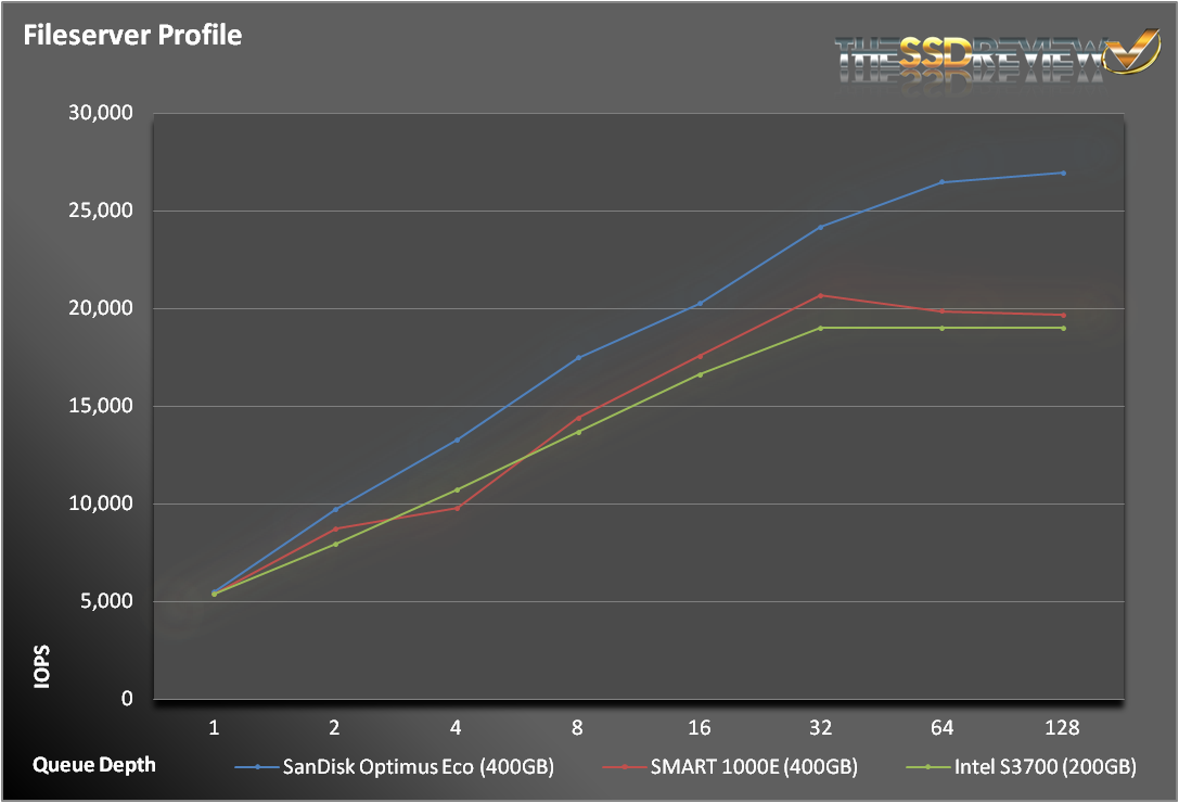 The Optimus Eco gets the wire-to-wire win for our fileserver profile. At higher queue depths, the Optimus Eco pulls away from its competitors.