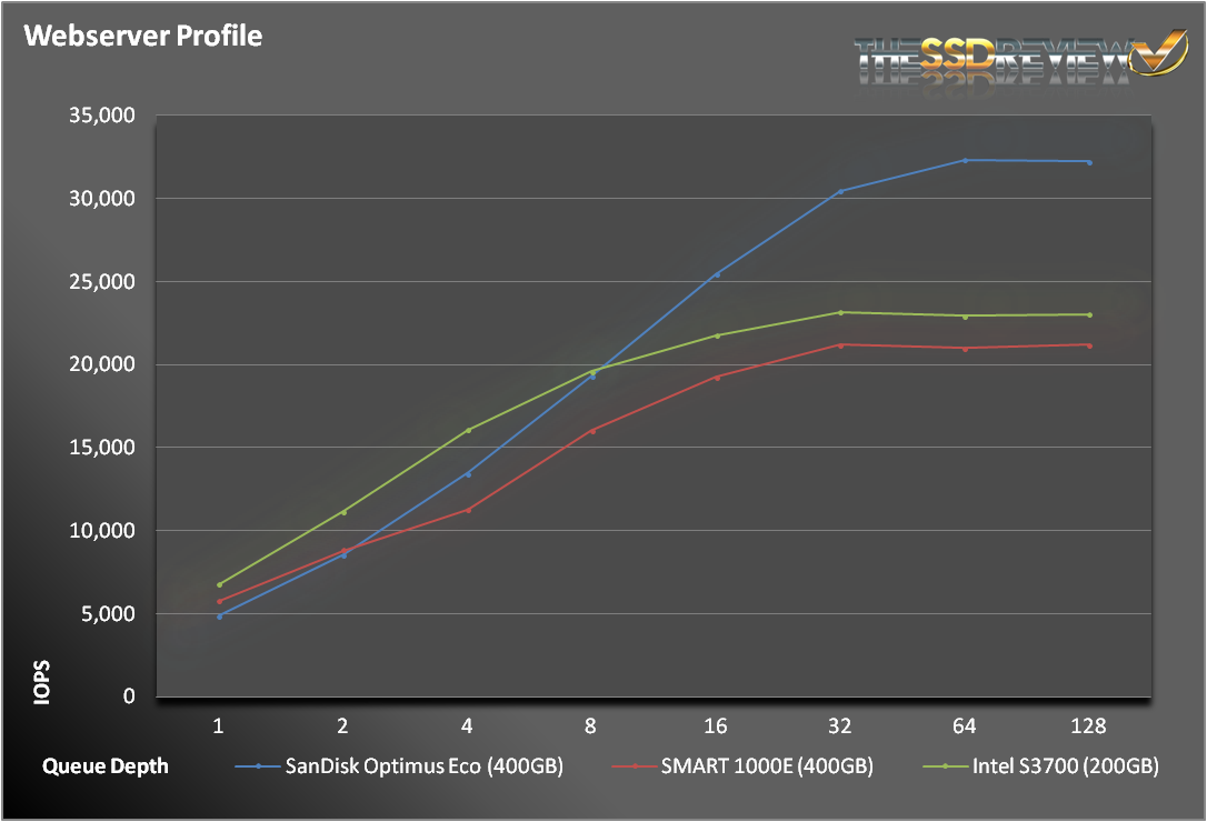 We got nearly identical results with our webserver profile. While the Intel S3700 outperformed the Eco at low queue depths, the Eco once again pulled away with sufficient outstanding IOs.