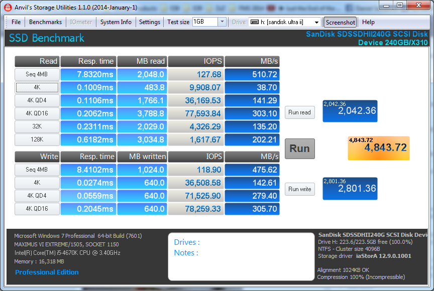 Anvil’s Storage Utilities (ASU) is the most complete test bed available for the solid state drive today. The benchmark displays test results for, not only throughput but also, IOPS and Disk Access Times. Not only does it have a preset SSD benchmark, but also, it has included such things as endurance testing and threaded I/O read, write and mixed tests, all of which are very simple to understand and use in our benchmark testing.