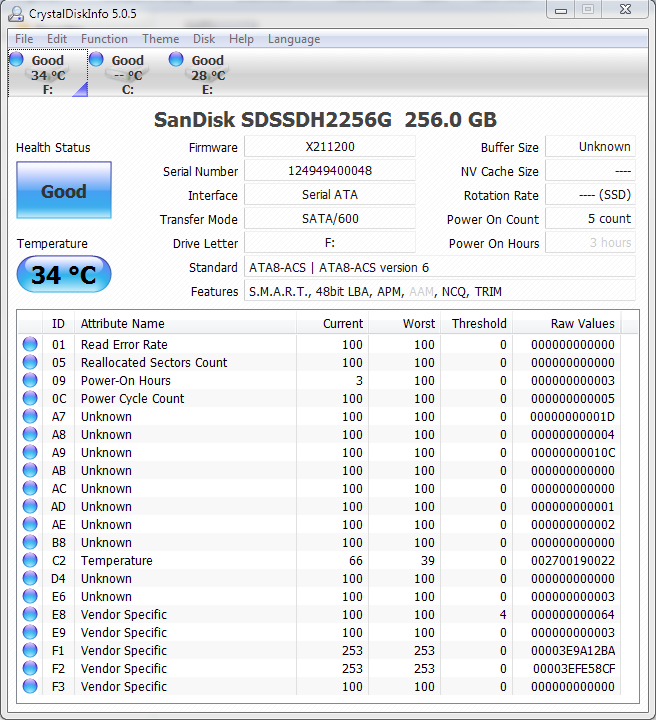 Crystal Disk Info provides some excellent information about the SSD itself to include its health, product information, power on information as well as the characteristics of the SSD. We can see that the SanDisk Ultra Plus is capable of TRIM as it is not greyed out, much like AAM.