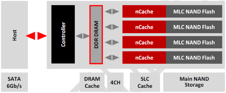 To combat this, SanDisk uses a small portion of their new 19nm 400Mb/s eX2 ABL MLC memory and creates an SLC style non-volatile cache. nCache gathers these small incompressible files together before flushing and consolidating them to the larger MLC section of the array, thus combating the slow write performance that we might normally see. SLC is much faster than MLC and it’s life span is 10 times that of MLC which theoretically provides a much lower write amplification, resulting in increased overall endurance.