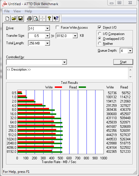 ATTO Disk Benchmark is perhaps one of the oldest benchmarks going and is definitely the main staple for manufacturer performance specifications. ATTO uses RAW or compressible data and, for our benchmarks, we use a set length of 256mb and test both the read and write performance of various transfer sizes ranging from 0.5 to 8192kb. Manufacturers prefer this method of testing as it deals with raw (compressible) data rather than random (includes incompressible data) which, although more realistic, results in lower performance results.