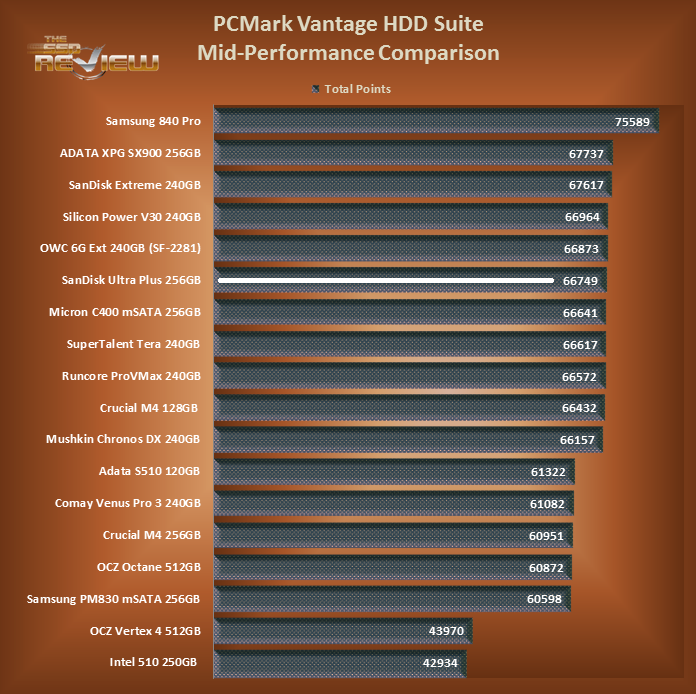The following chart is based only on PCMark Vantage scoring and represents a cross of mid-level SSDs that are a comparative to the SanDisk Ultra Plus.