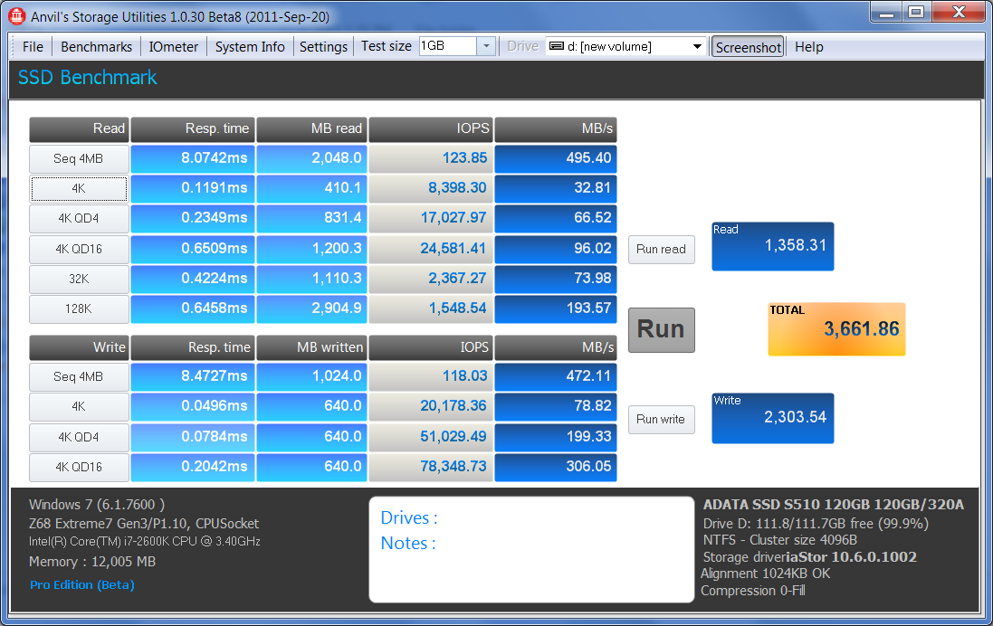 You may not see this for long (and its definitely not common) but you get a freebee simply for reading! Over the last little while, we have been assisting with beta testing new benchmark software called Anvil Storage Utilities which is an absolutely amazing SSD benchmarking utility. Not only does it have a preset SSD benchmark, but also, it has included such things as endurance testing and threaded I/O read, write and mixed tests, all of which are very simple to understand and utilize in our benchmark testing. Lets see how the AData S510 120GB SSD fares on Anvil Pro: