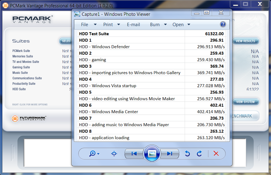 The s510 pulled off a Vantage Total Points high of 61322 points with a high transfer speed of 402MB/s in utilizing Windows Media Player. Lets take a look at the numbers: