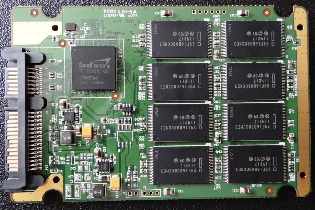 Inside, we find the PCB with the LSI SandForce SF-2281 processor and 16 pieces of Intel 25nm 16GB synchronous NAND flash memory, eight pieces being located on each side of the PCB.