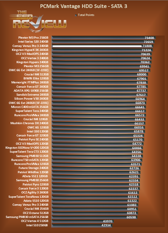 The Venus Pro 3 pulled through Vantage Testing with a high Total Point Score of 71808 points which makes this the third highest SATA 3 SSD score we have attained to date. Placing just above the Kingston Hyper X 3k and just below the Intel 520 was definitely not a result we had expected. The high transfer speed reached during testing was 421MB/s while testing in Media Center.