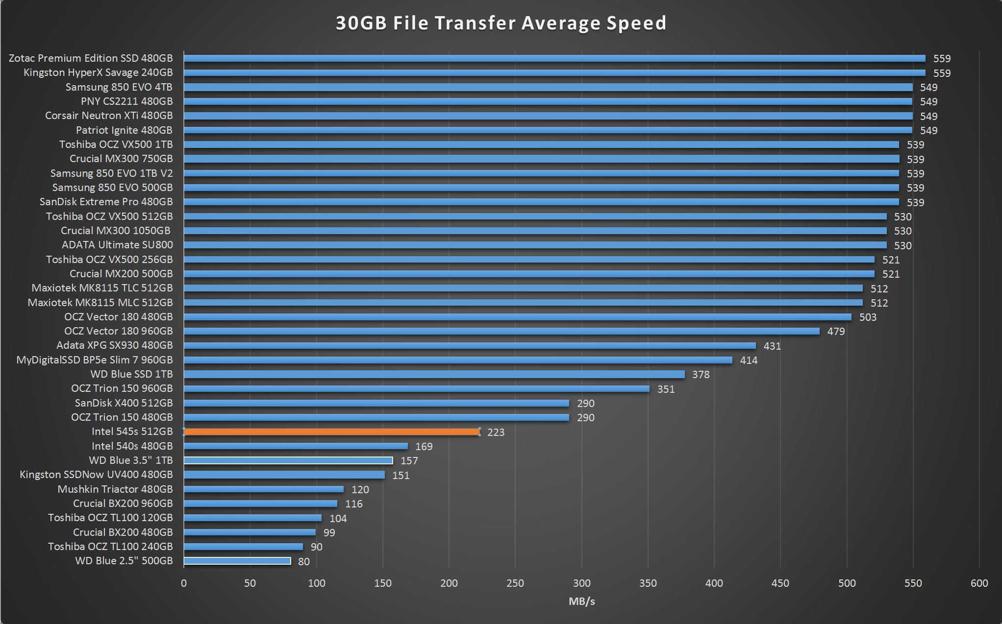 We also wanted to see how performance was in a real-world use when transferring large files to the SSD. For this test, we are going to simply stress write performance by transferring over a 30GB folder of movies off of a 512GB Samsung 950 Pro to the test SSDs and time how long it takes. Once complete we can calculate the average speed.