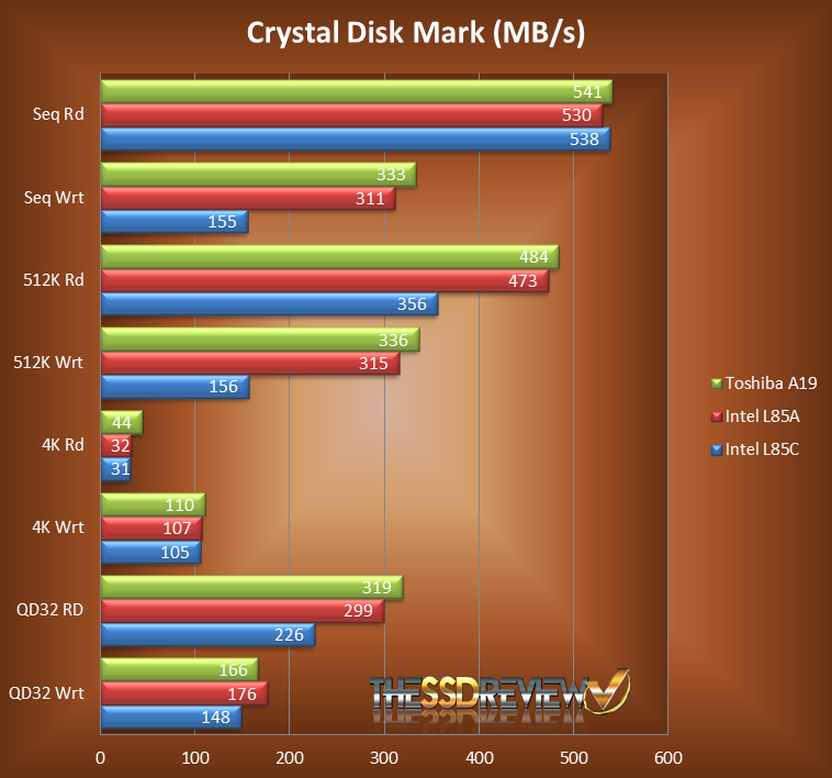 While the Toshiba A19 and IMFT L85A are relatively similar, we see at significant drop in write performance with the IMFT L85C memory. This might be something noteworthy to watch for as we use other benchmark software.