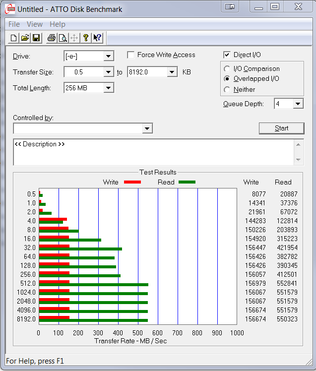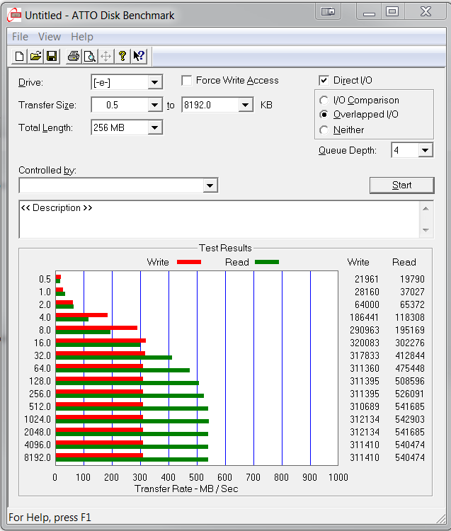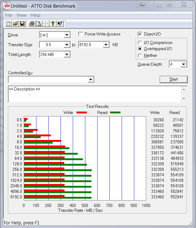 ATTO Disk Benchmark is perhaps one of the oldest benchmarks going and is definitely the main staple for manufacturer performance specifications. ATTO uses RAW or compressible data and, for our benchmarks, we use a set length of 256mb and test both the read and write performance of various transfer sizes ranging from 0.5 to 8192kb. Manufacturers prefer this method of testing as it deals with raw (compressible) data rather than random (includes incompressible data) which, although more realistic, results in lower performance results.