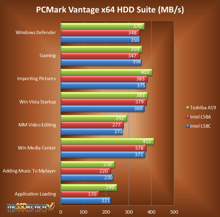 The SSD Review uses benchmark software called PCMark Vantage x64 HDD Suite to create testing scenarios that might be used in the typical user experience. There are eight tests in all and the tests performed record the speed of data movement in MB/s to which they are then given a numerical score after all of the tests are complete. The simulations are as follows: