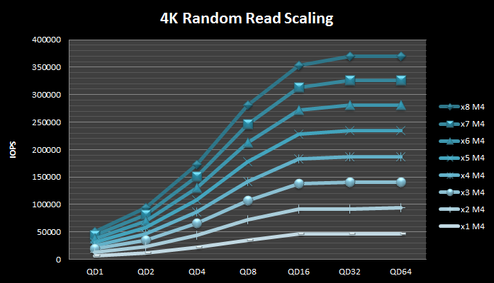 Starting with 4K random reads, the results of adding seven additional drives is immediate.