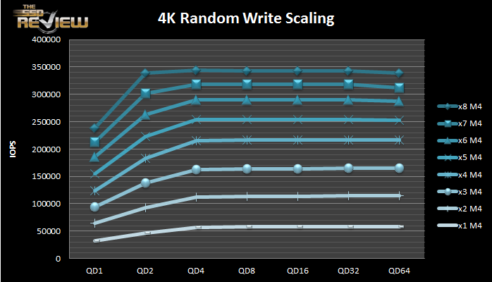 The M4s don’t quite scale perfectly with random writes at higher queue depths. Two, three, and four drives compound well, but after that, performance begins somewhat poorly.