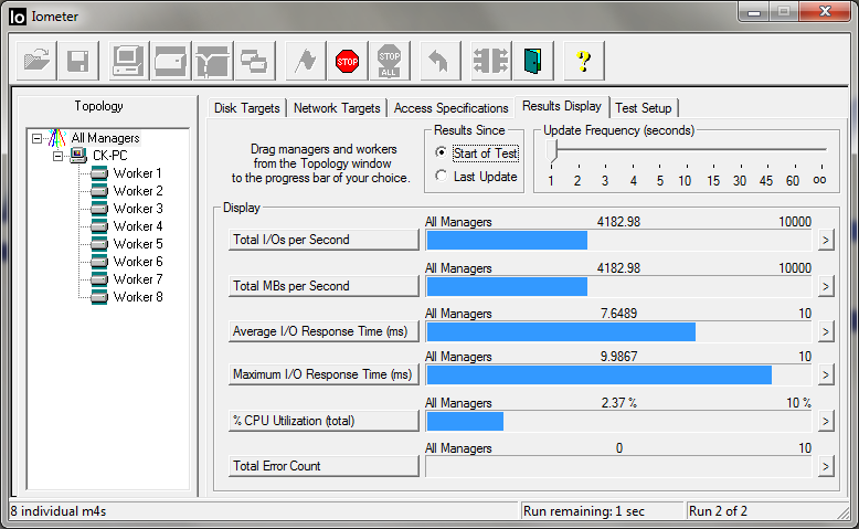 The IOmeter shot shows 1MB sequential writes pushing 4.1GB/s through the controller. Excellent stuff.