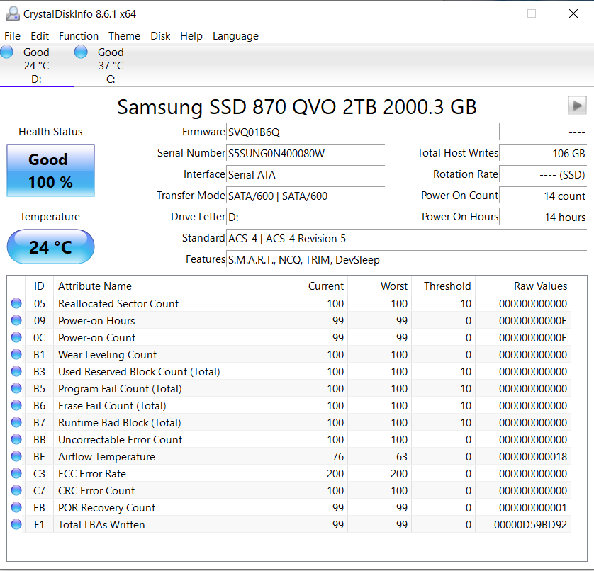Crystal Disk Info is a great tool for displaying the characteristics and health of storage devices. It displays everything from temperatures, the number of hours the device has been powered, and even to the extent of informing you of the firmware of the device.