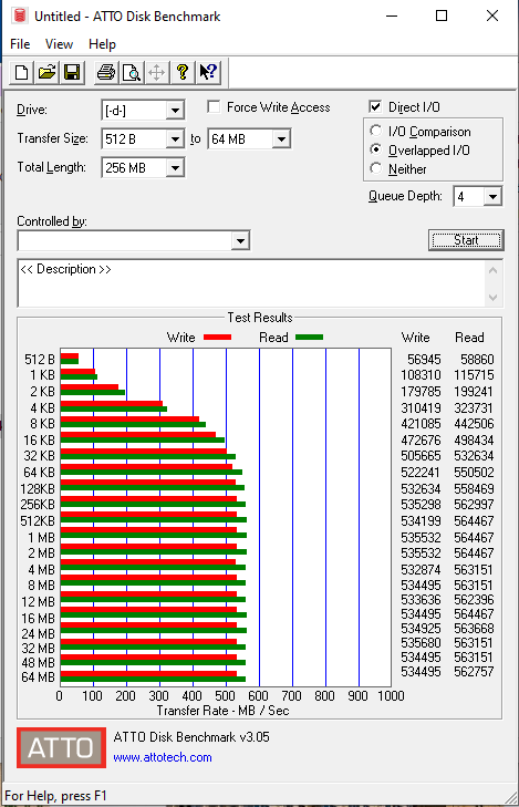 ATTO Disk Benchmark is perhaps one of the oldest benchmarks going and is definitely the main staple for manufacturer performance specifications. ATTO uses RAW or compressible data and, for our benchmarks, we use a set length of 256mb and test both the read and write performance of various transfer sizes ranging from 0.5 to 8192kb. Manufacturers prefer this method of testing as it deals with raw (compressible) data rather than random (includes incompressible data) which, although more realistic, results in lower performance results.