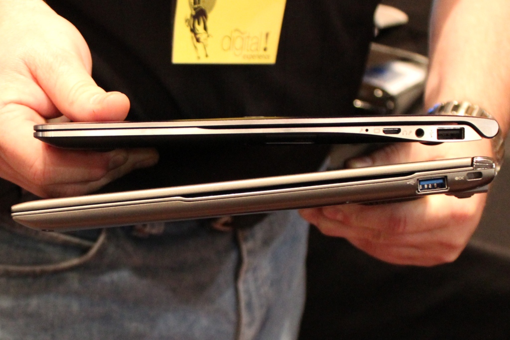 We left the best to last and the above photo depicts this very well. Somehow, the Samsung Series 9 has trumped the Toshiba Z830 (bottom) and appears to be significantly thinner. It weighs in at a very similar 2.5 lbs, is only .6″, and it has a very solid feel to it as the Toshiba does. The series 9 monitor does not have the flex of the Toshiba and potential buyers should know that the flex they feel in Z Series screens is intentional and meant to counteract shock.