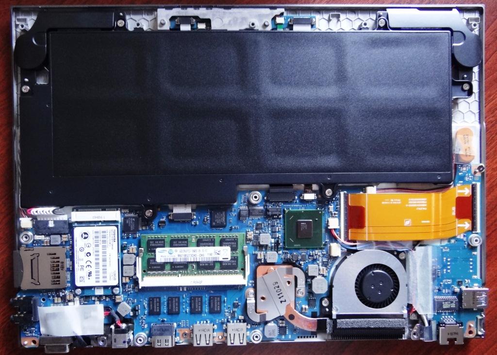 The Z830 is relatively simple to open with 13 screws around the outside bottom and one torx security screw under the center rubber pad. Once opened, the SSD can easily be switched off for those that just have to have SATA 3 and can be seen in the picture below on the left with RAM to its right. Clicking on any of our review photos brings up larger and better images.