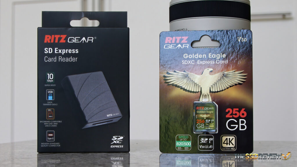 Today we are evaluating the Ritz Gear Golden Eagle 256GB SDXC Express Card along with its USB 3.2 10Gbps Type-C SD Express Card (SDx) Reader. Both pieces right now can be found at Amazon, sold together and at a 50% discount for $150, $299 with a 50% coupon when you place a checkmark in the appropriate box. Not so fast though. This SDx card boast performance of 820MB/s read and 500MB/s write yet only holds a UHS 3 speed class of 30MB/s and V30 video speed class of 30MB/s. We found this a bit odd, especially since there was no mention in the advertisement of it being UHS-I or II much as you see in any advert on Amazon. There is a reason.