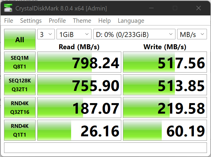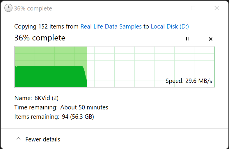 In transferring our 85GB 8K video folder, the transfer speed was dead on at 500MB/s for the first 25GB and then performance dropped like a rock to just under 30MB/s where it remained for the rest of the transfer. Now we might find this odd but this is EXACTLY as advertised with write performance of 500MB/s and sustained write speeds at V30…of 30MB/s. If we would have run this through any other SD card reader in the world that is not specifically a SDx reader, we would have seen performance of around 100MB/s max initially, followed by that drop to just under 30MB/s. The reason for such is the fact that the memory in use for this device is QLC NAND without a buffer chip and using a specific partition of that QLC NAND in SLC mode to create that buffer. When the buffer fills, performance drops.
