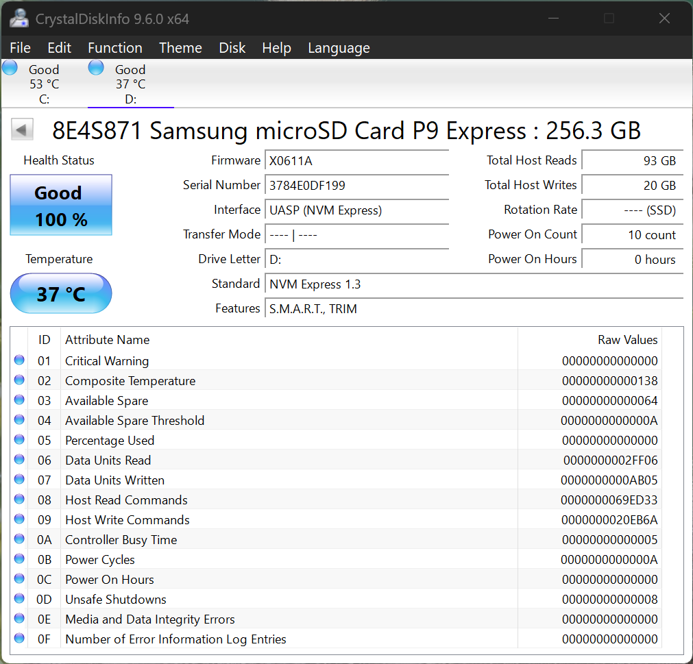 Crystal DiskInfo validates that our Samsung P9 Express microSD Express Card is operating within the NVMe interface which means it is using the PCIe 3.0 lane and follows the NVMe 1.3 standard. It is also interesting to note that these cards are TRIM compatible, whereas a normal UHS -I/II card does not even show up in this software.