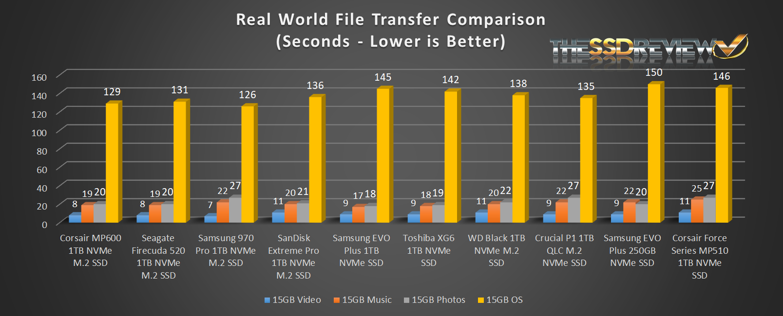 For our Real World File Transfer Comparison of the world’s top M.2 NVMe SSDs, we have included nine of the top Gen 3 SSDs tested to date, along with the Seagate Gen 4 FireCuda 520. This test is conducted through the transfer of data from one spot on the test drive to another to give us the truest of transfer speed results for that device.