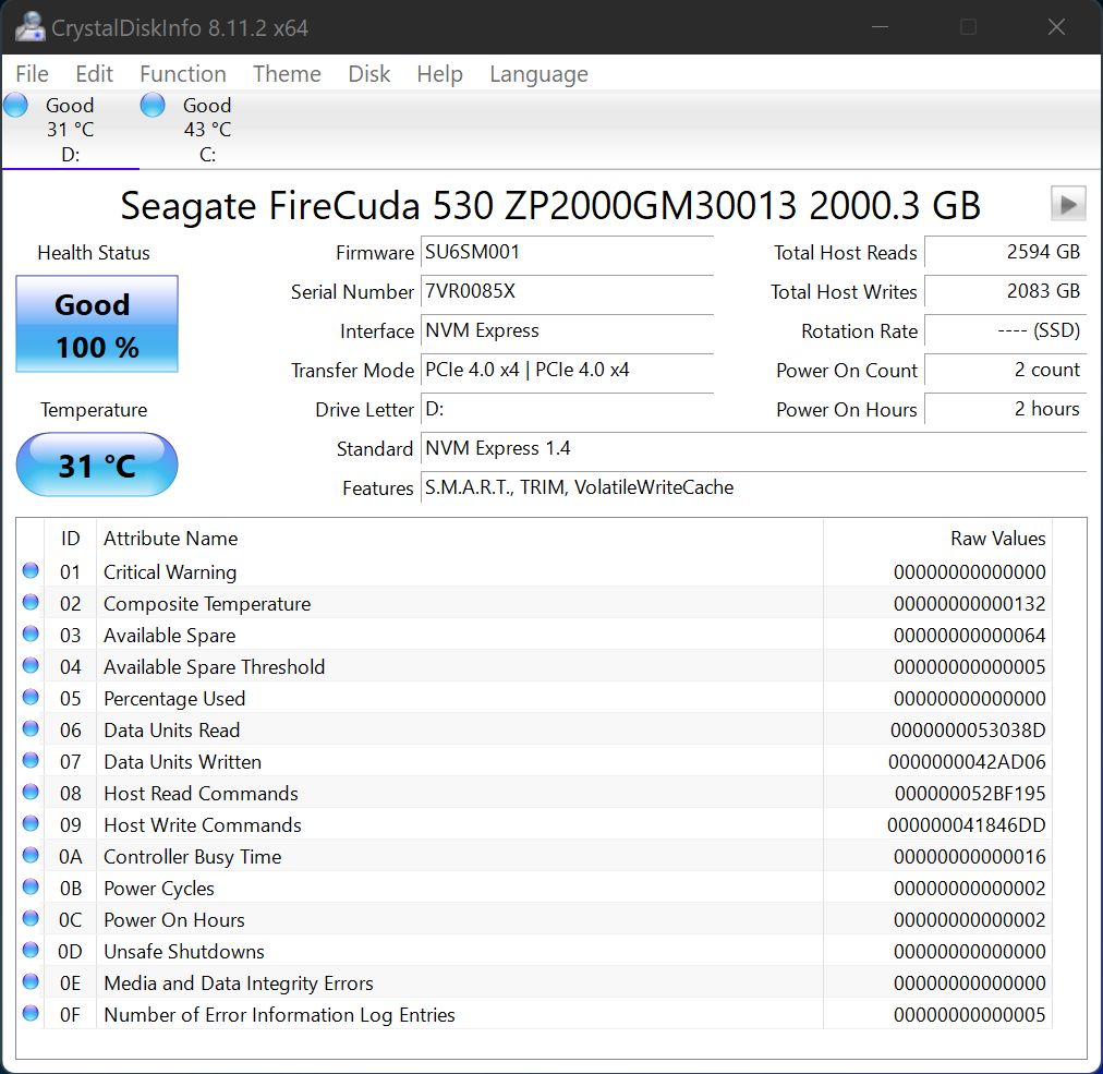 Crystal DiskInfo validates that our SSD is running in PCIe 4.0 x4, using the NVMe 1.4 protocol and confirms that it is TRIM capable. On the top right, we can see that we have put through more than 2TB in both Total Host read and writes.