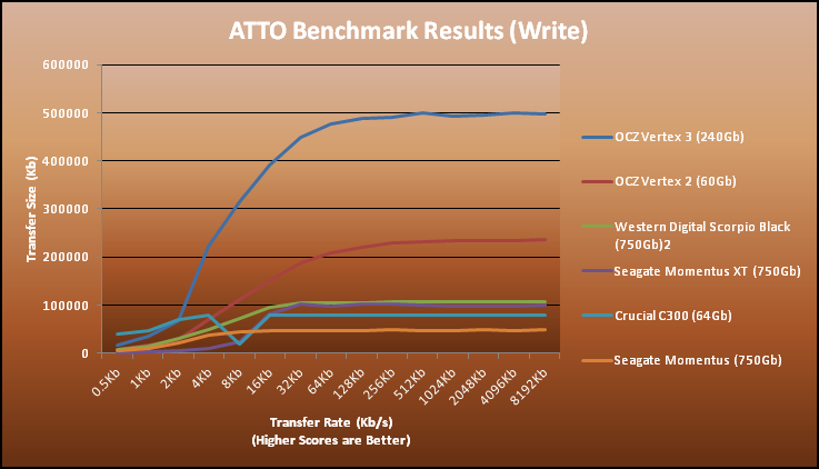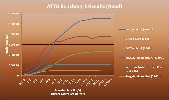 ATTO was set to a length of 256Mb transfer from 0.5Kb to 8192Kb. The results are the same as we have been seeing. NAND is just not utilized, not even in the ATTO benchmark. Take note that while the Momentus XT shows a sizeable improvement over the first generation Momentus (as it has shown in other benchmarks as well), it is essentially on par with the Western Digital Scorpio Black, again due to the fact that the SSD segment of the Momentus XT is not exercised