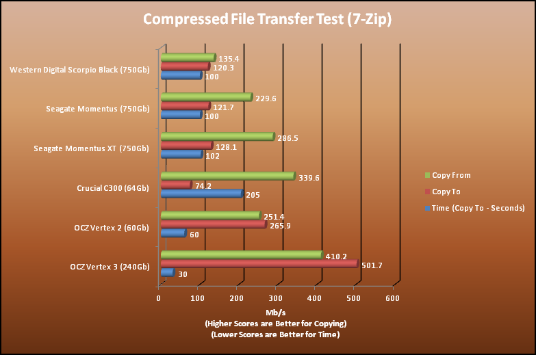 For this test, a handful of files and folders totaling 15Gbs were compressed to 10Gbs using 7-Zip on ultra compression. The transfer speed and time of compression was then calculated: